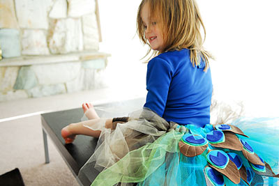 Potrzebujemy: kawałki niebieskiego, zielonego i brązowego tiulu, filc w podobnych kolorach, kawałek szerokiej gumy na pasek, turkusowa tasiemka do mocowania pawich oczek do tiulu.